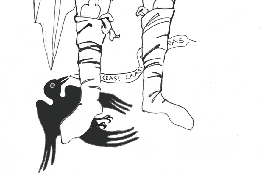 У день, коли мало відбутися таїнство, звідкись прилетів чорний ворон, який кружляв над головою святого та вигукував слово «cras» (схоже на крик цього птаха, для нас більш звичний як «кар»), що в перекладі з латині означає «завтра». Але легіонер схопив ворона і, голосно промовивши слово «hodie» (що латиною означає «сьогодні»), розтоптав птаха.