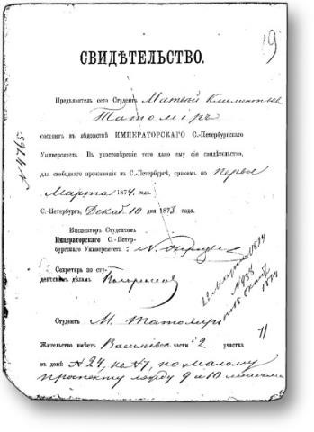 Из университетского личного дела М.К. Татомира видно, что средств к существованию у него нет, и, желая сохранить статус студента и оттянуть оплату, он переводится с факультета на факультет. Все тщетно. Еще и было оклеветано его бескорыстное выступление в защиту любимого профессора, известного своей добротой и помощью бедным студентам, уволенному позднее из университета за критику Каткова.