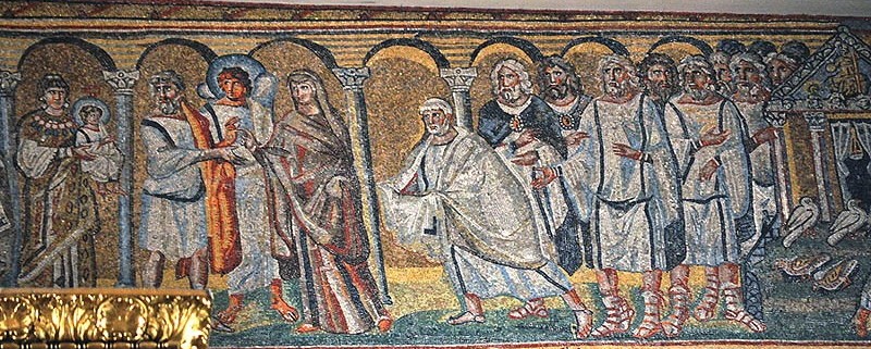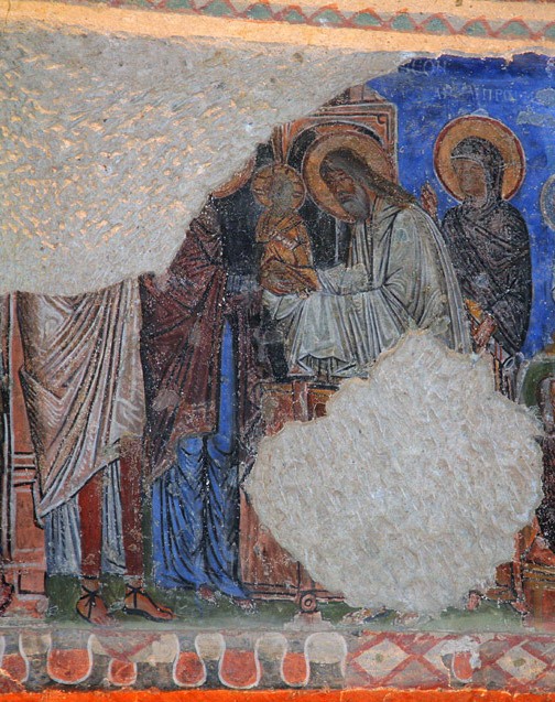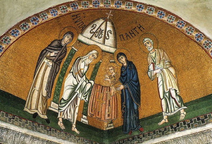 А там стояли тысячи евреев с 40-дневными младенцами, пришедшие для очищения. Но когда вошел старец Симеон, сгорбленный и весьма согбенный, с ослабевшими зрением и слухом, то из того места, где стояла Матерь Божия – среди стольких тысяч женщин и мужчин, – вспыхнул луч света, подобный солнечному. И по этому сияющему лучу пошел он к Матери Божией. А Спаситель в объятиях Матери Божией сиял, подобно молнии. И когда увидел Его старец Симеон, то взял Господа на руки и со слезами сказал: